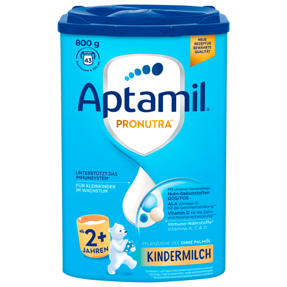 Обогатена млечна напитка за малки деца, с 25% ферментирала млечна смес.С Pronutra™ и нашата уникална комбинация от съставки Обогатен с желязо за подпомагане на развитието на мозъка и витамин D, за подпомагане на нормалната функция на имунната система. Пригодено да поддържа хранителните нужди на малкото дете. Витамини A, C, D, калций, желязо, омега-3, хранителни фибри (GOS/FOS). Без палмово масло. Маслена смес. Вдъхновено от 50 години изследвания на храненето в ранна детска възраст. nAptamil® Toddler Milk е разработено, за да отговори на повишените хранителни нужди на малки деца на възраст 2+ години.Подпомага здравословния старт на малкото дете с2 чаши на ден(2 х 150 мл) Осигурява 100% от препоръчителното дневно количество витамин D за малки деца, калций за нормален растеж и развитие на костите, йод, който подпомага нормалния растеж на децатаn
