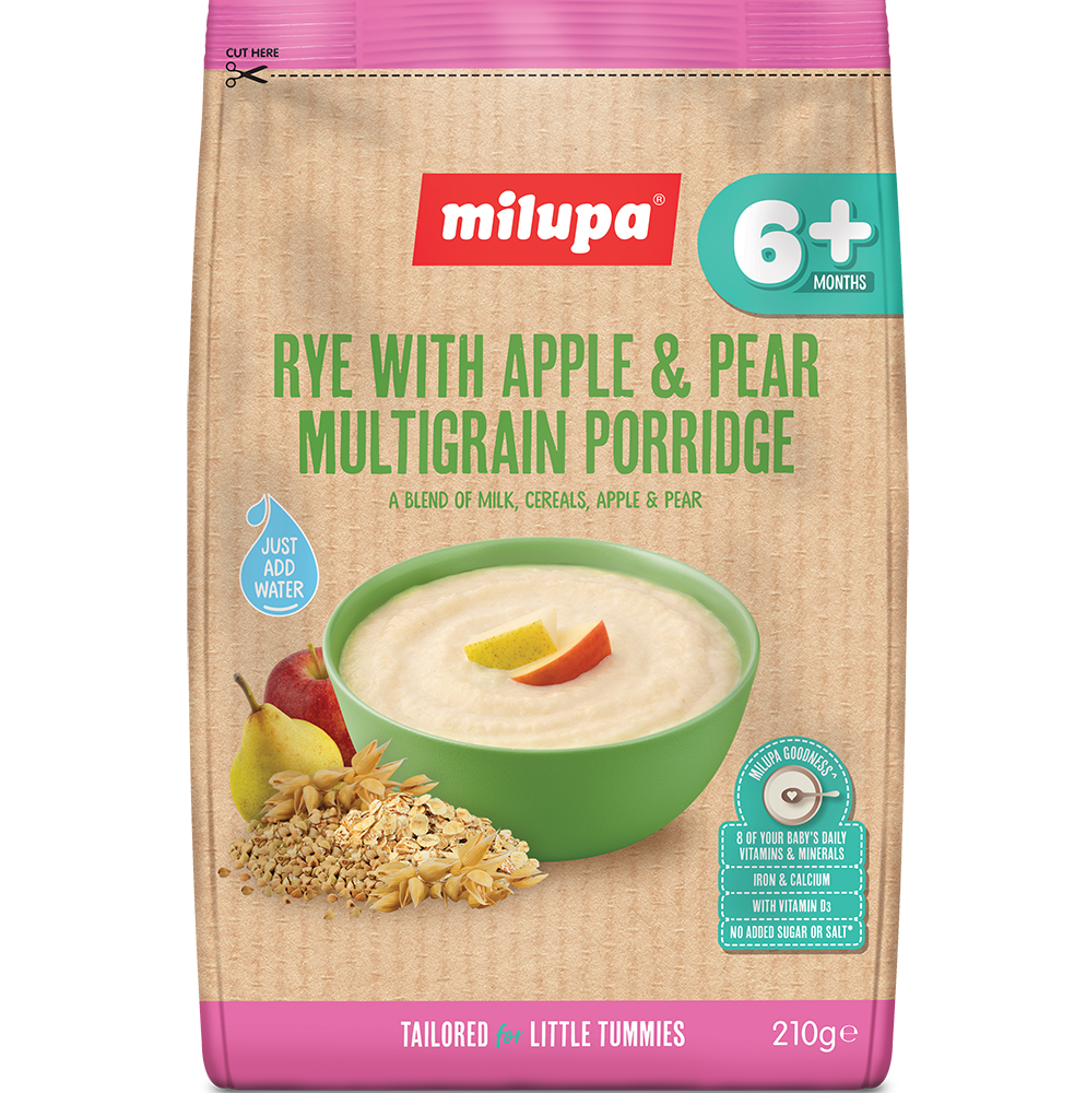 Смес от пшеница, ръж, овес, лимец, просо и елда с мляко, банани, къпини и боровинки. Нашата вкусна зърнена закуска е добър начин за въвеждане на по-плътни текстури за бебета на възраст 7+ месеца.Хранително пригодена да бъде част от диета за отбиване, нашата вкусна многозърнеста зърнена култура се предлага в затваряща се опаковка за безопасно и лесно съхранение, съдържа желязо за подпомагане на нормалното когнитивно развитие, както и добавен витамин A, C и D и не съдържа консерванти, без добавена захар или сол.