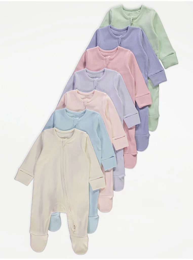 Pastel Ribbed Zip Fasten Sleepsuits 7 Pack